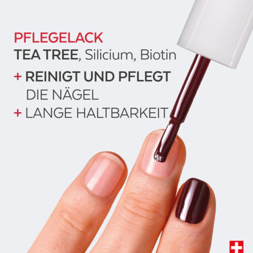 Angereichert mit Teebaum, Silizium und Biotin unterstützt der Lack ein gepflegtes, ebenmäßigeres und harmonischeres Erscheinungsbild der Nägel. Die langanhaltende Formulierung sorgt für eine gleichmäßige Deckkraft, ein sauberes Farbergebnis und ein gepflegtes Finish im Alltag.